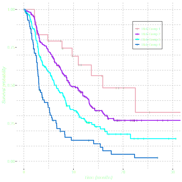 Kaplan Meier plot to show survival estimates within each of the 4 risk groups